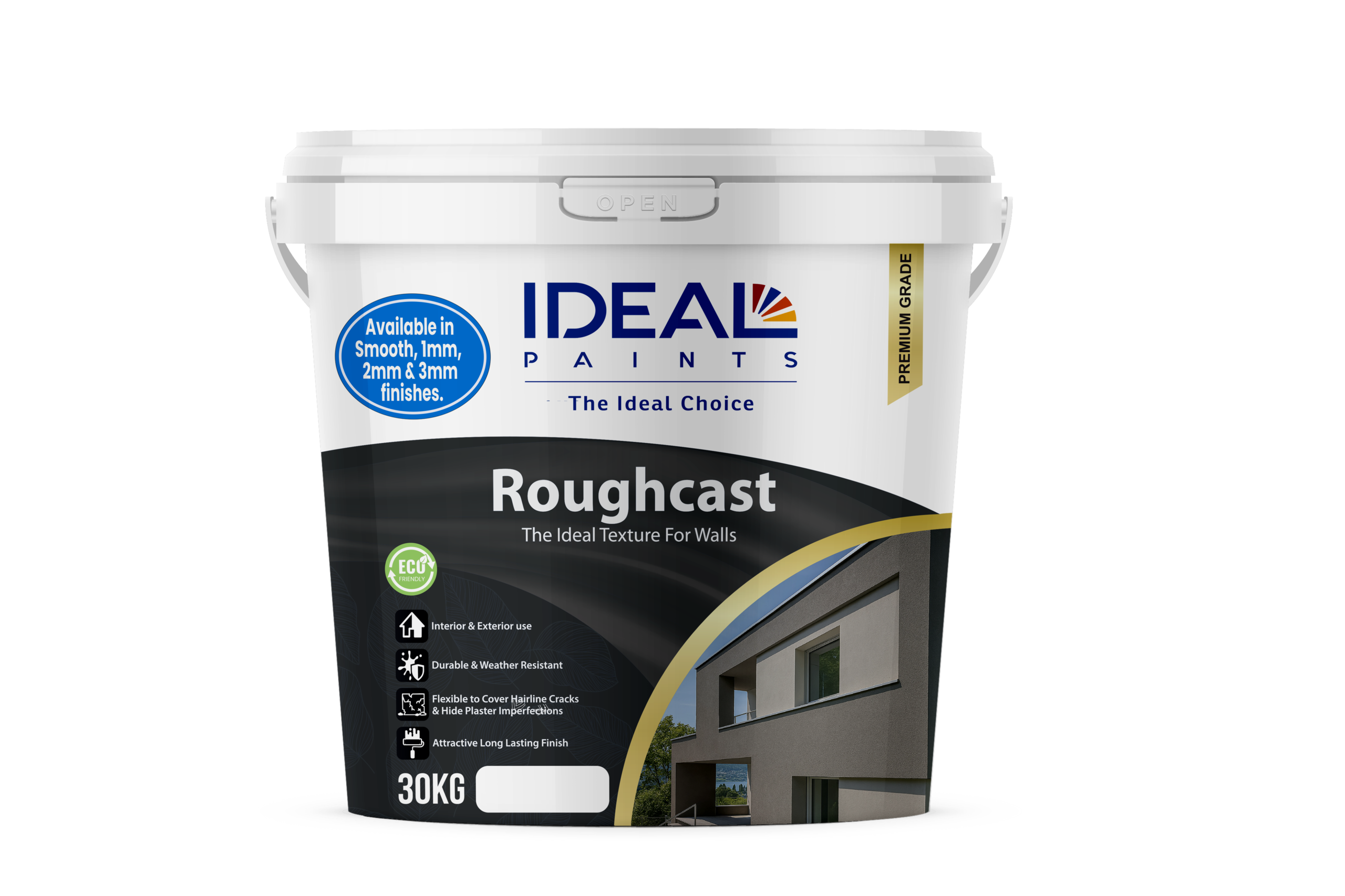 Ideal Roughcast is a textured Acrylic emulsion-based coating which offers a tough, durable and attractive finish. It is based on 100% pure acrylic emulsion resin. It is suitable for use in new and previously painted plaster, cement rendering, concrete block, stone etc. The roughcast formulation incorporates a versatile fungicide and algaecide to combat mould and algae growth both in the can and on the wall.