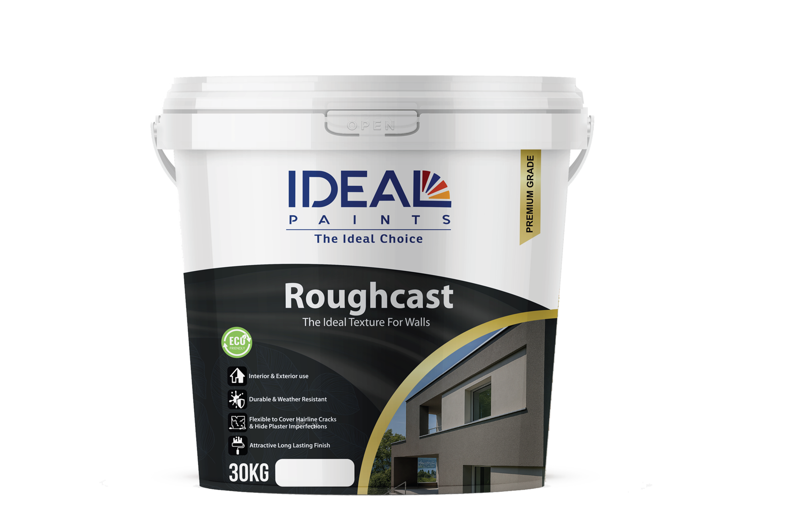 Ideal Roughcast is a textured Acrylic emulsion-based coating which offers a tough, durable and attractive finish. It is based on 100% pure acrylic emulsion resin. It is suitable for use in new and previously painted plaster, cement rendering, concrete block, stone etc. The roughcast formulation incorporates a versatile fungicide and algaecide to combat mould and algae growth both in the can and on the wall